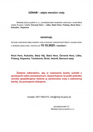 od 10.10.2025 platí zákaz pitia vody priamo z vodovodu. Vo vode je možný výskyt koliformných baktérií, preto Vás žiadame o tepelnú úpravu vody (stačí ju dostať do bodu varu), po ktorej je voda bezpečná. Na prípravu tepelne upravených pokrmov, hygienu a pod. je voda nezávadná. Tento stav platí do zmazania oznamu.